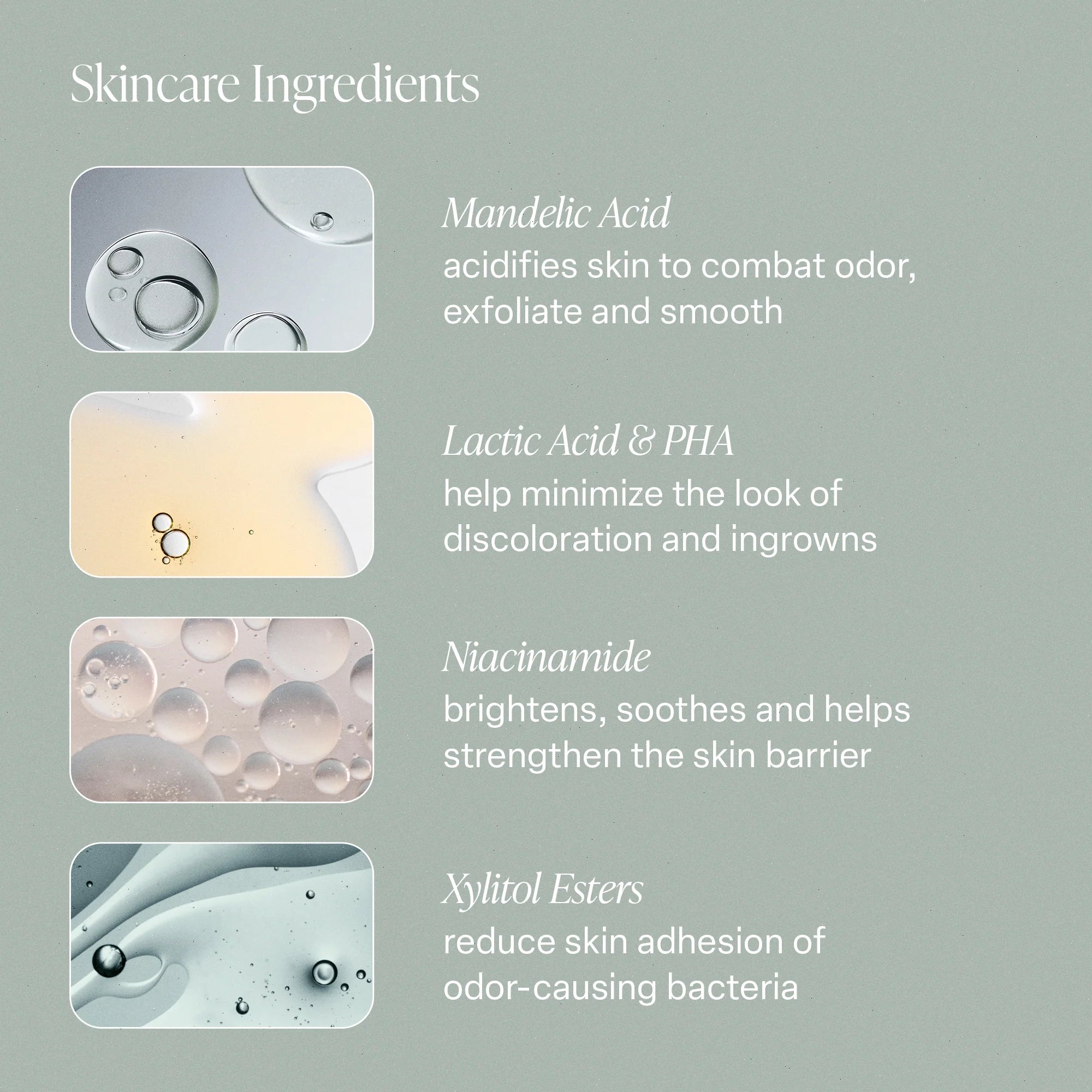 Mandelic Acid - Acidifies skin to combat odor, exfoliate and smooth.